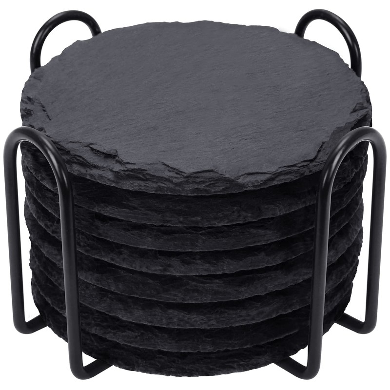 GOH DODD Drink Coasters with Holder, 8 Pieces Round Slate Stone Coasters 4 Inch Handmade Coasters for Bar and Home, Black