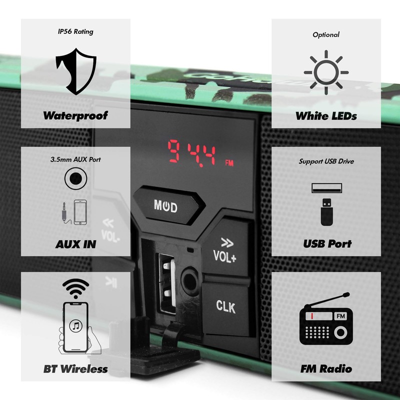 - 24 White LEDs Strip. Turn On and Off with One Click! Dual Waterproof Motorcycle Stereo Speakers with Aluminum Stereo Main Unit. *Camouflage colors and patterns on the screen may vary from actual product. High Performance Power Amplifier Built-in. Speaker Clamp Universal fit 7/8 – 1 1/4" handlebar. Support Bluetooth Wireless connection up to 15 meters.