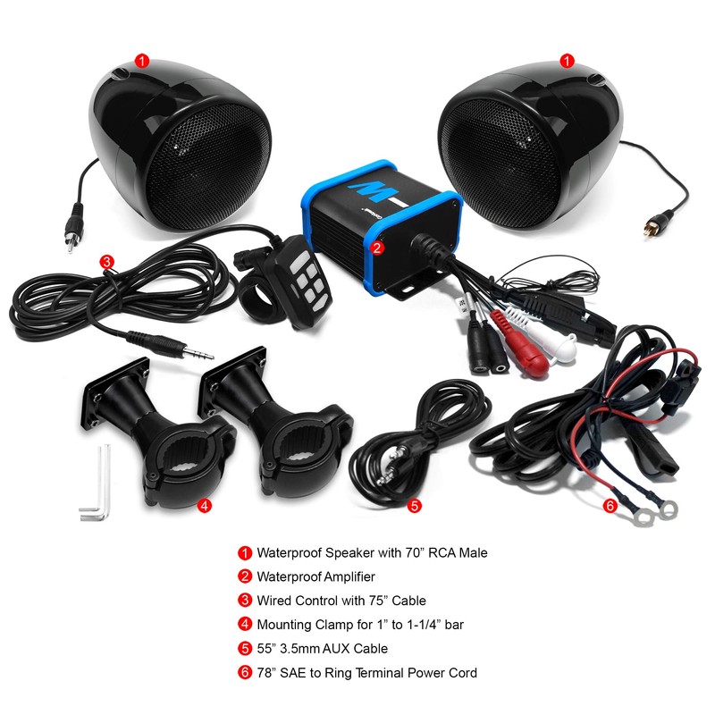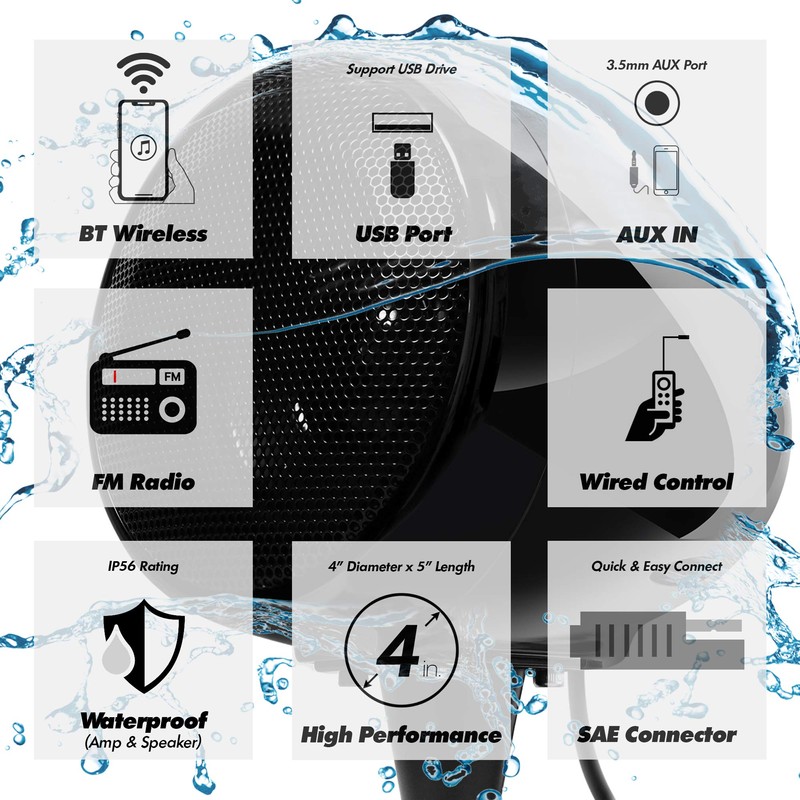 GoHawk TN4-W Waterproof Amplifier 4" Full Range Bluetooth Motorcycle Stereo Speakers 1 to 1.25 in. Handlebar Mount Audio Amp System Harley ATV 4-Wheeler USB, AUX FM Radio (TN4-W Black)