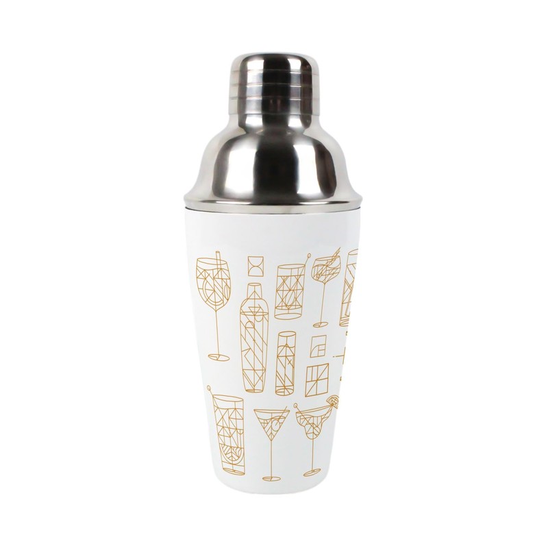 - Host 1920's style cocktail parties and perfect your bartending skills with this art-deco cocktail shaker! Decorated with a variety of different cocktails, finished in a luxurious gold.