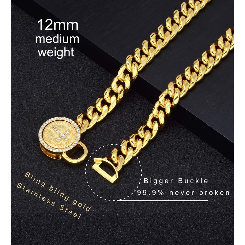 Gold Cat Dog Collar Kitten Puppy 12mm Wide Stainless Steel Kitten Choker Curb Chew Proof Cuban Link 1/2inch Chain Hip Hop Cross Button Buckle