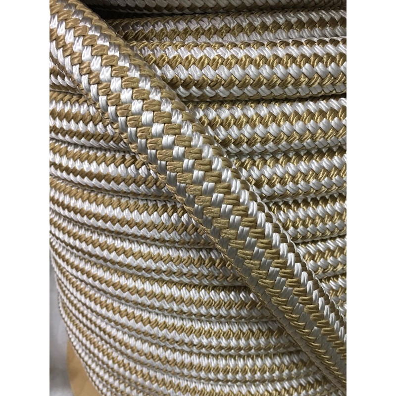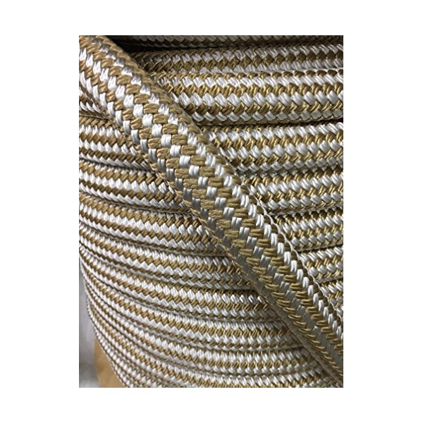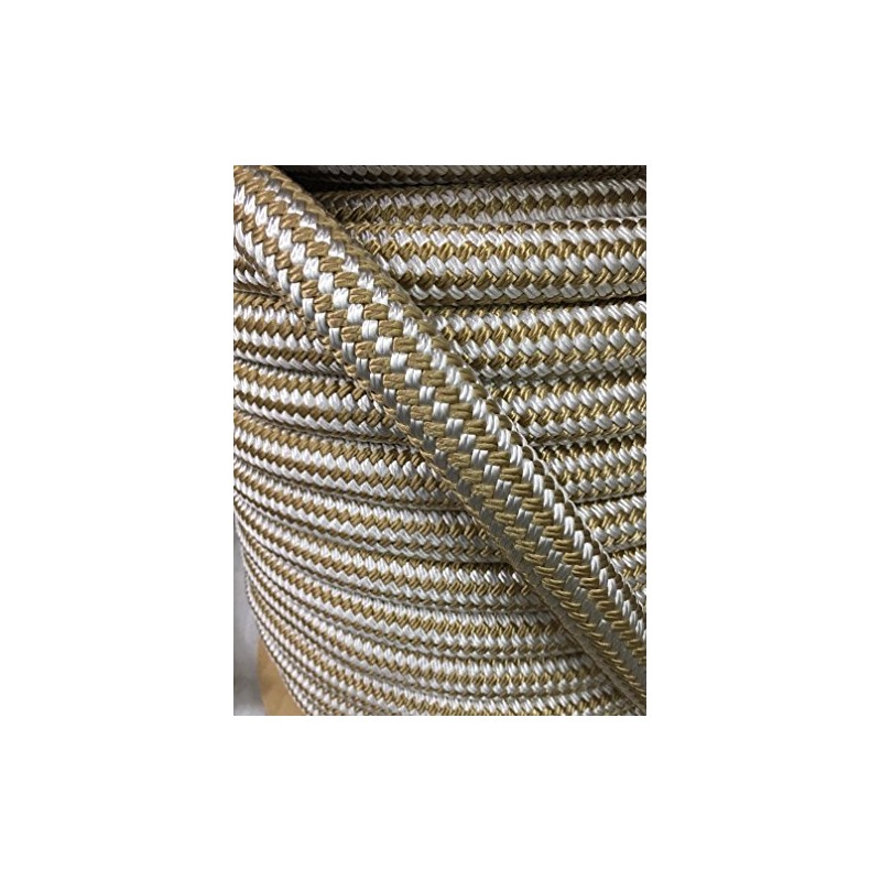 This is one inch gold braid double braided nylon rope. Available in 50 feet, 100 feet and 150 feet. About 30,000 pounds tensile strength. Excellent rope for anchor line, tow line, dock line, shock absorbers, mooring line and many other uses. This line is cut to length and does not come spliced. Torque free. Made in the USA.