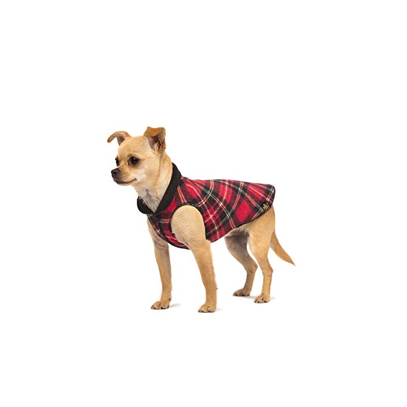 Gold Paw Duluth Double Fleece Dog Coat Pullover - Soft, Warm Dog Clothes, 4-Way Stretch Pet Sweater - Machine Washable, All-Season, Red Tartan/Black, Size 6