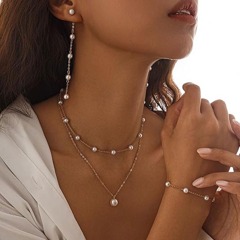 - 【The pearl set】 This pearl set jewelry design is very exquisite and beautiful. The pearl jewelry set consists of a beautiful necklace, pearl bracelet and pearl pendant earrings. See the picture description for details. It also has a meaning that it can bring good luck to people. In order to make this product eye-catching in appearance and inside, the designer spent a lot of time designing the template. That's why this necklace looks so beautiful. Can give someone a new look. Let you wear it to shine on all occasions. Suitable for occasions such as weddings, parties, engagements, classrooms, dates, beaches, families, offices, daily life, etc.