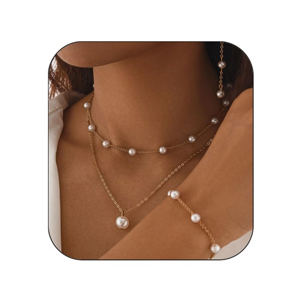 Gold Pearl Necklace and Earring Set for Women Elegant Bridesmaid Jewelry Set for Wedding Dainty Gold Jewelry Set for Women Pearl Choker Necklace and and Pearl Bracelet Pearl Earrings Jewelry Gifts
