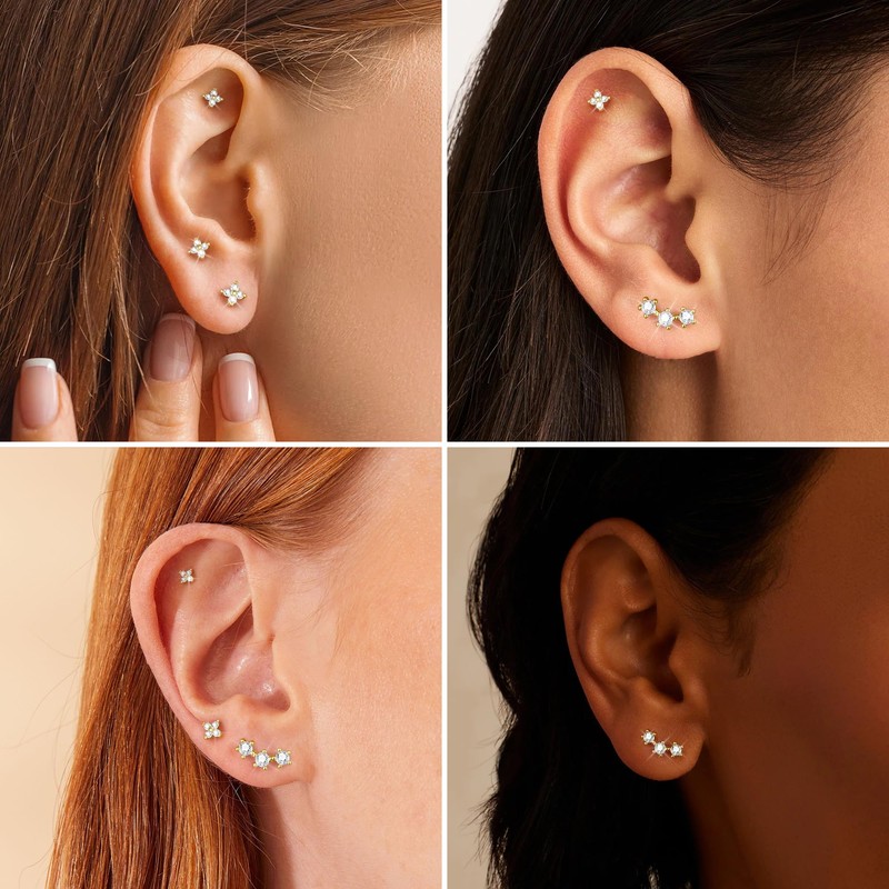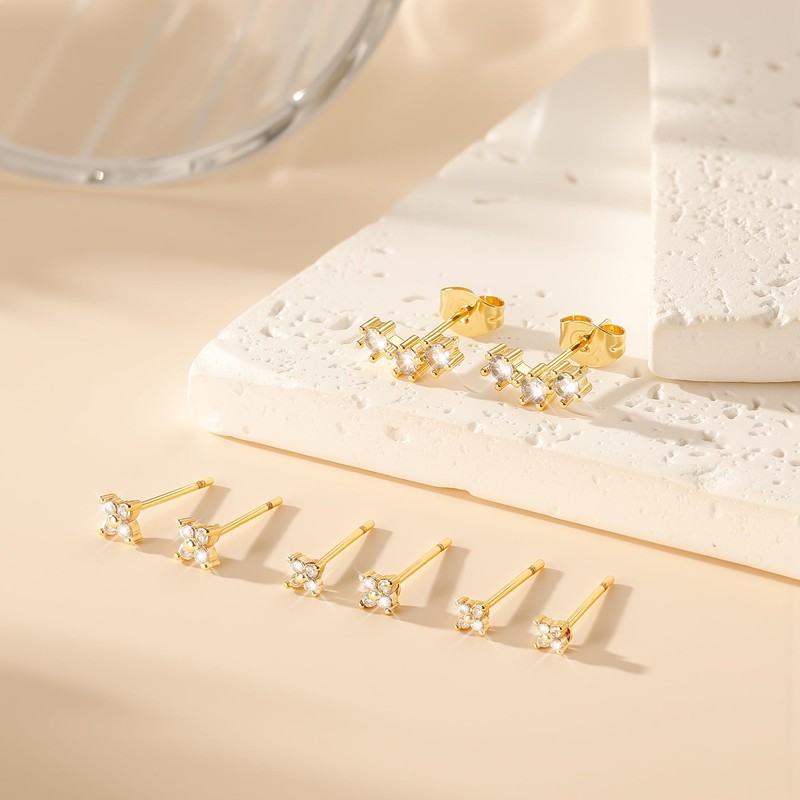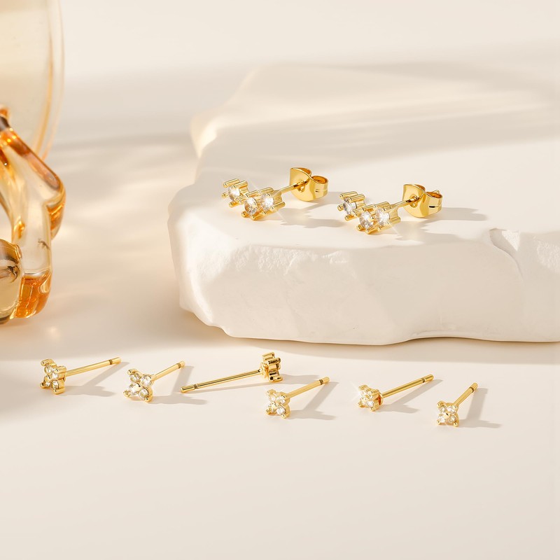 • 【Gold Stud Earrings】This gold stud earring set consists of three pairs of earrings: three pairs of cz studs in varying sizes and one pair of cz cartilage earrings. The design is trending and simple, making it versatile for any outfit and perfect for everyday wear.