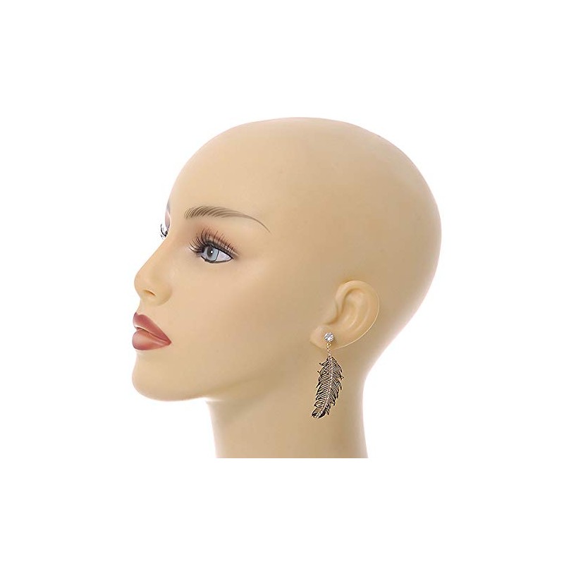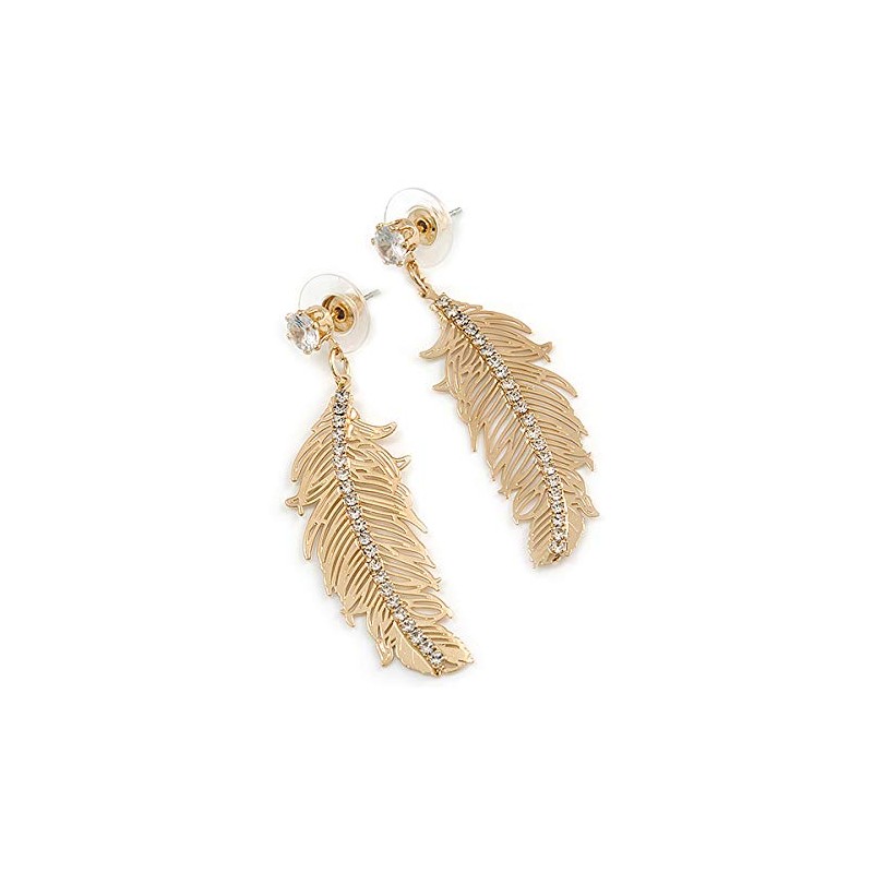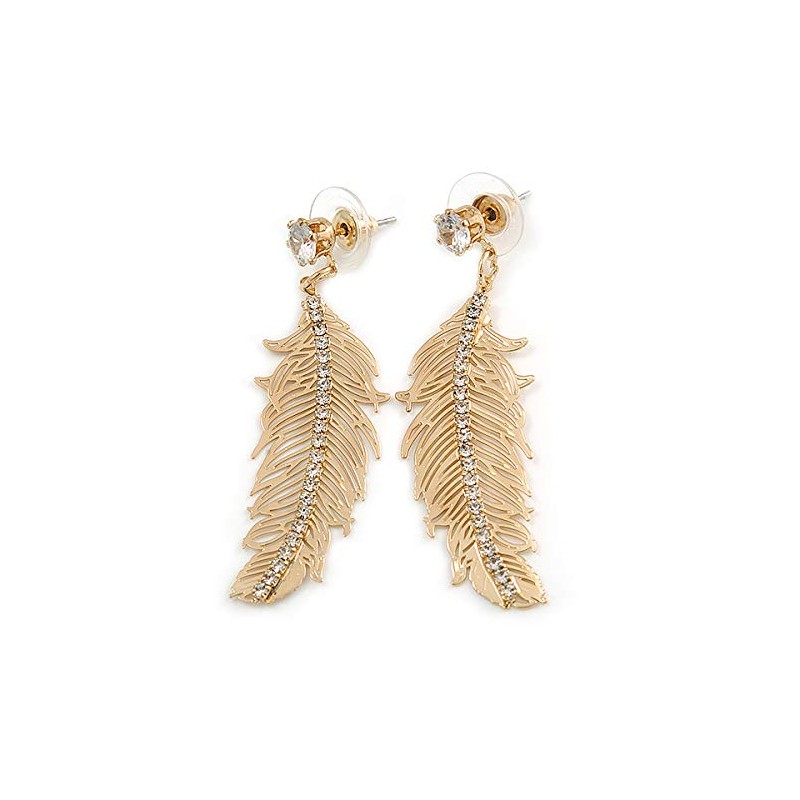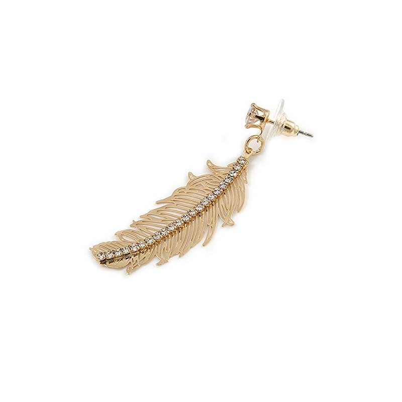 Gold Tone Clear Crystal Delicate Feather Drop Earrings - 50mm Long