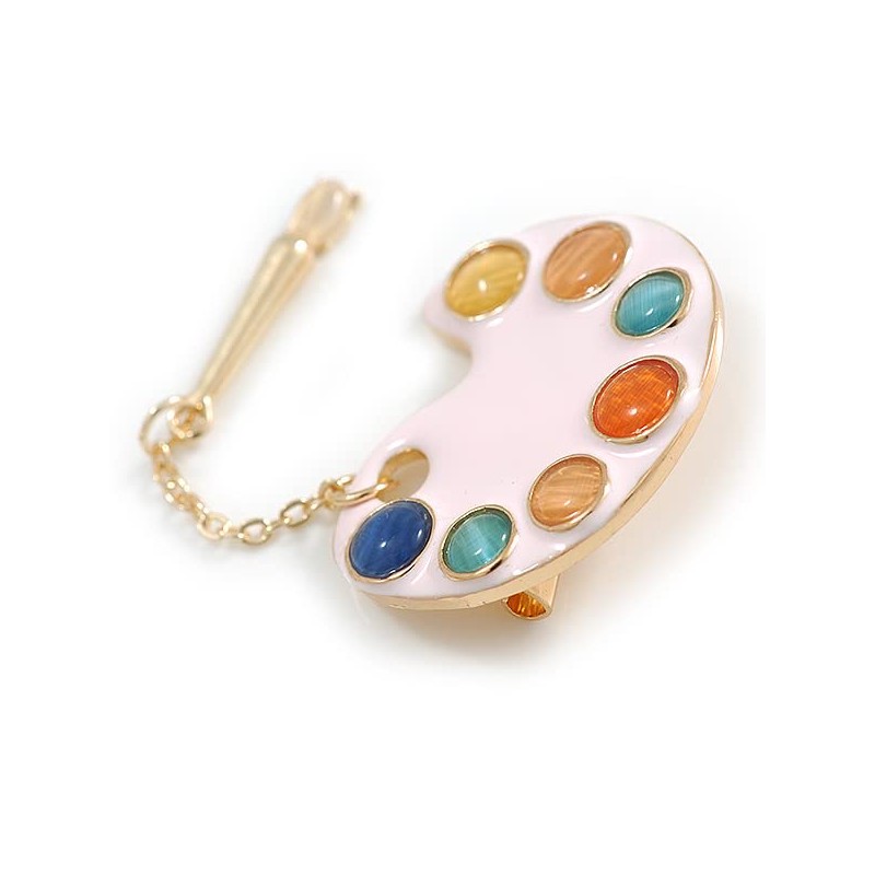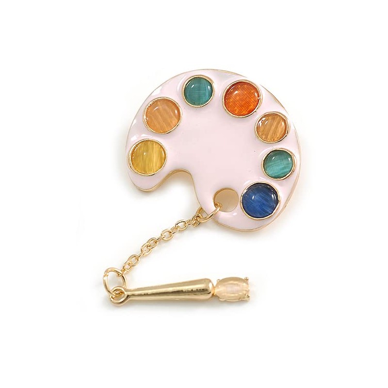 Gold Tone Enamel Artist Paint Palette with Dangling Brush Brooch - 35mm Wide