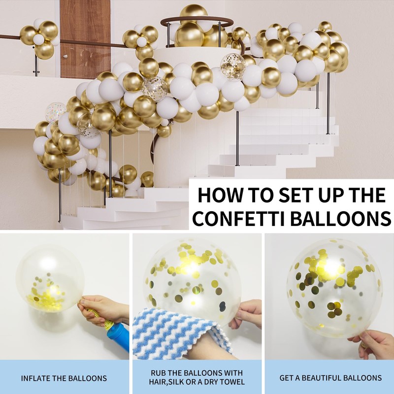 - đYou Will Get:The package comes with 110pcs 12" Balloons(50pcs in metallic gold,50pcs in white,5pcs in confetti gold,5pcs in confetti color ),40pcs 5"Ballons(20pcs in metallic gold,20 in white), Additional Gold DIY set: Happy birthday banner(1pcs), Star banner decoration(2pcs),Metallic ribbons(2pcs), Dot glue tape(1pcs),ballon strip(1pcs*5M),knotter(1pcs),Pump(1pcs).The gold-white decoration set enough for you to let your creativity run wild and enjoy the DIY fun.