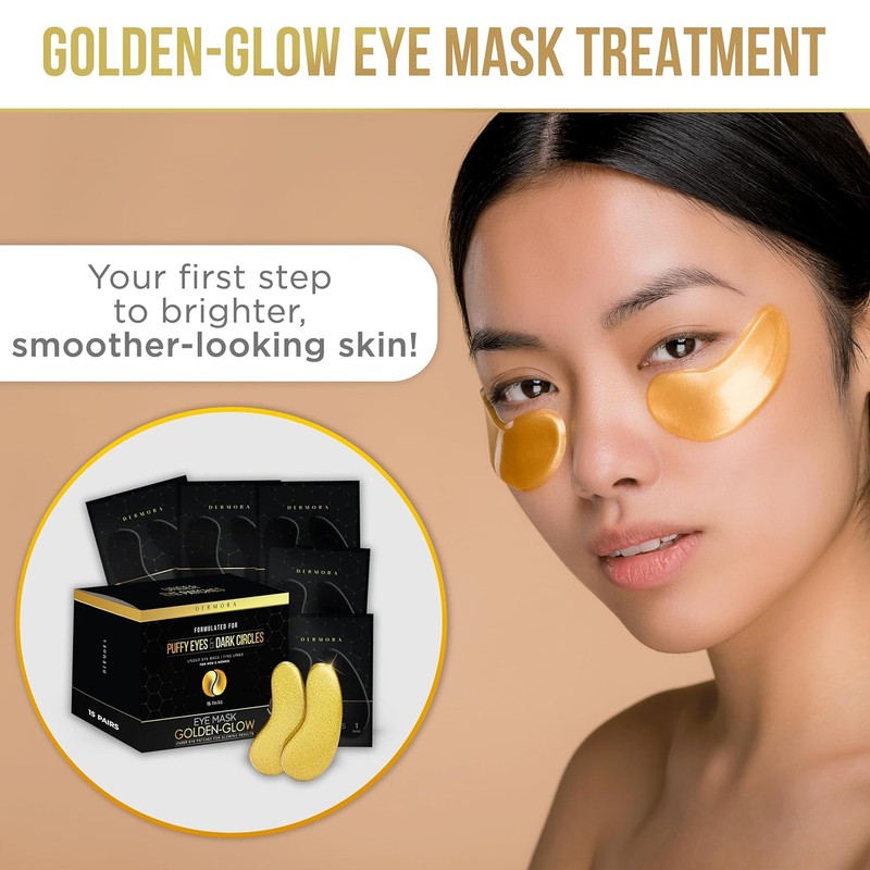 DERMORA Golden Glow Under Eye Patches | Rejuvenating Treatment | Dark Circles, Puffy Eyes, Refreshing, Revitalizing, Travel, Wrinkles | 20 Pairs Eye Gels