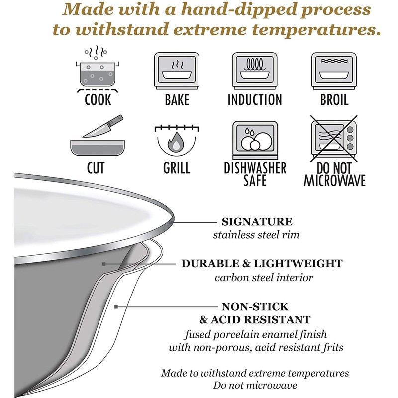 - Elegant Porcelain Enamel Finish on Carbon Steel with Stainless Steel Rim