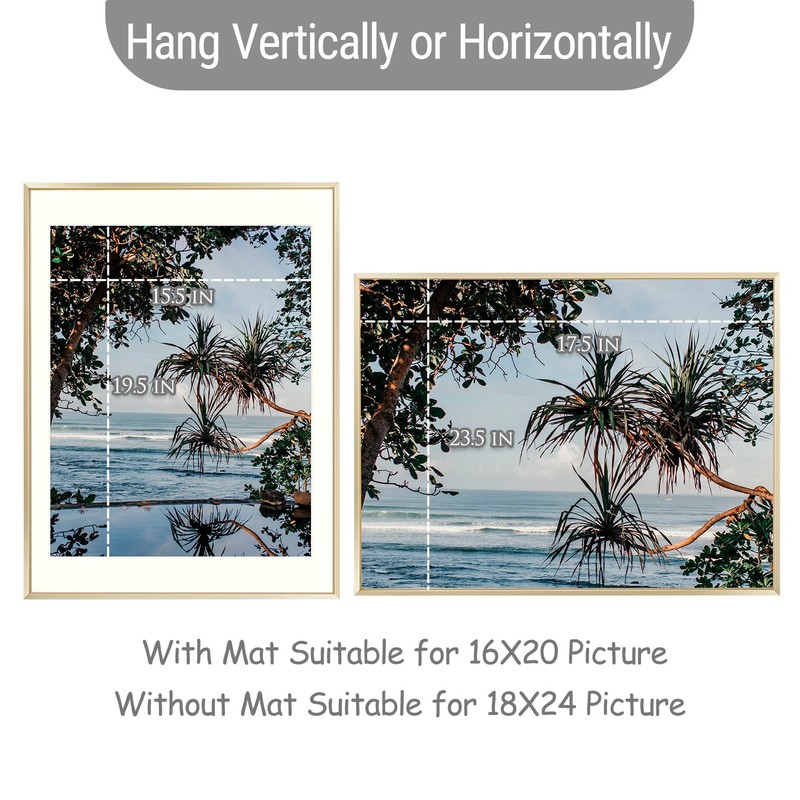 - Can Display Pictures: 18x24(Without Mat) or 16x20(with Mat); Frame Includes a Single Ivory Color Mat (Opening Size: 15.5x19.5 ) For 16x20 Pictures