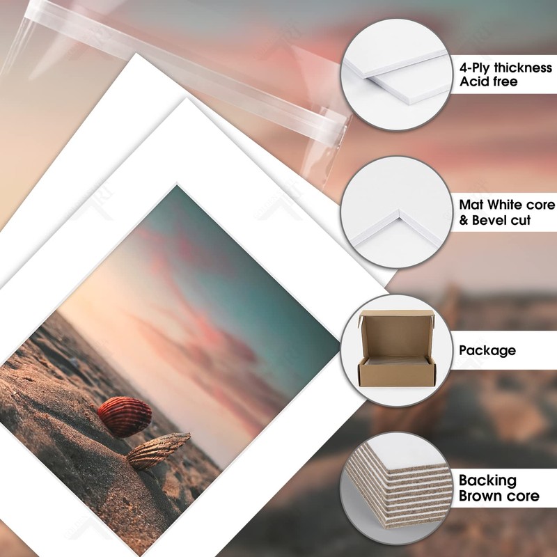 - The mats are beveled cut with white core and 4-ply thick (about 1.4 mm or 1/16 inch), The backing is white on both side.