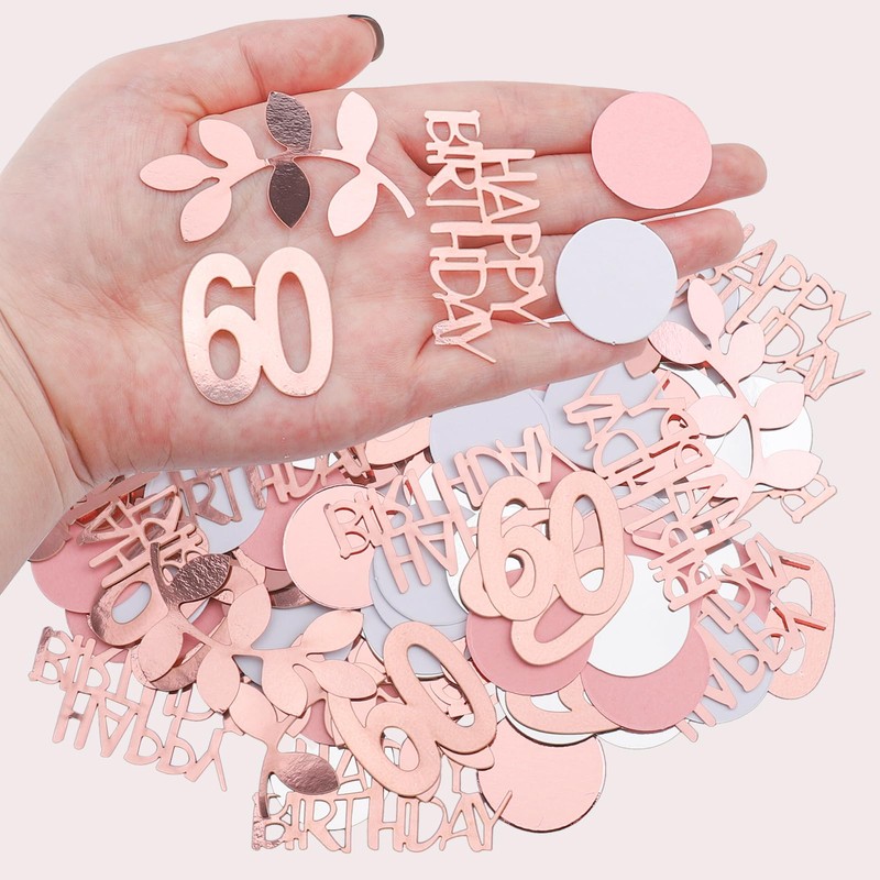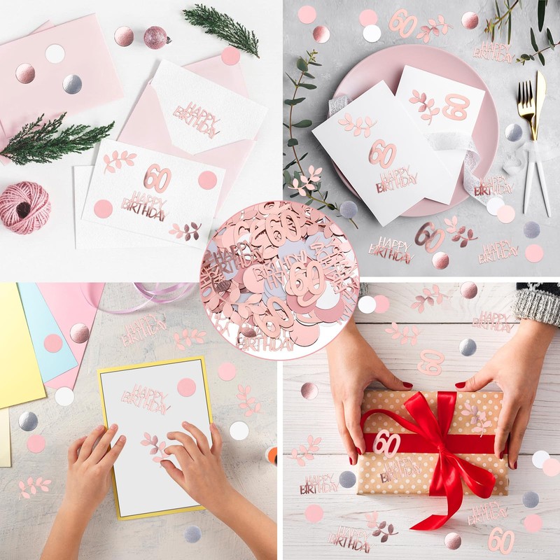 - Confetti 60th birthday package list: you will receive approx. Pack of 200 60th birthday decoration confetti. Contains scattering numbers 60, polka dots, eucalyptus leaves, happy birthday letters, 4 elements, classic simplicity. If you are planning a 60th birthday party, the elegant 60th birthday table decoration is the ideal decoration to celebrate your birthday, highlight your birthday party, make your own occasion unique and eye-catching, and impress others
