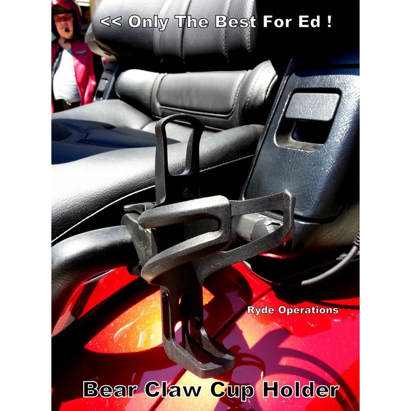 Bear Claw's Satin Black motorcycle Cup Holder has been updated for improved grip and appearance. Designed to easily install on the passenger grab rails of your late model Honda Goldwing.