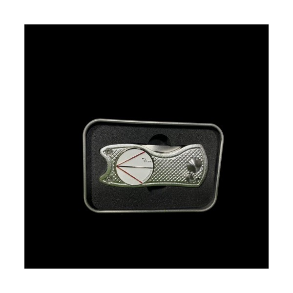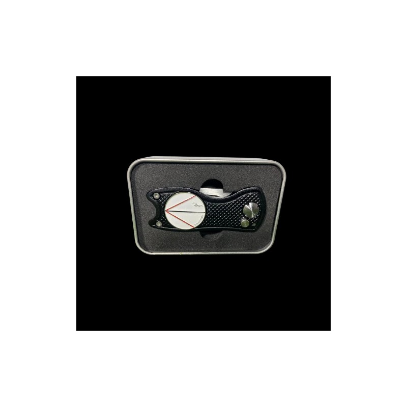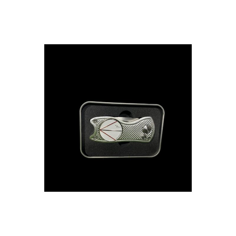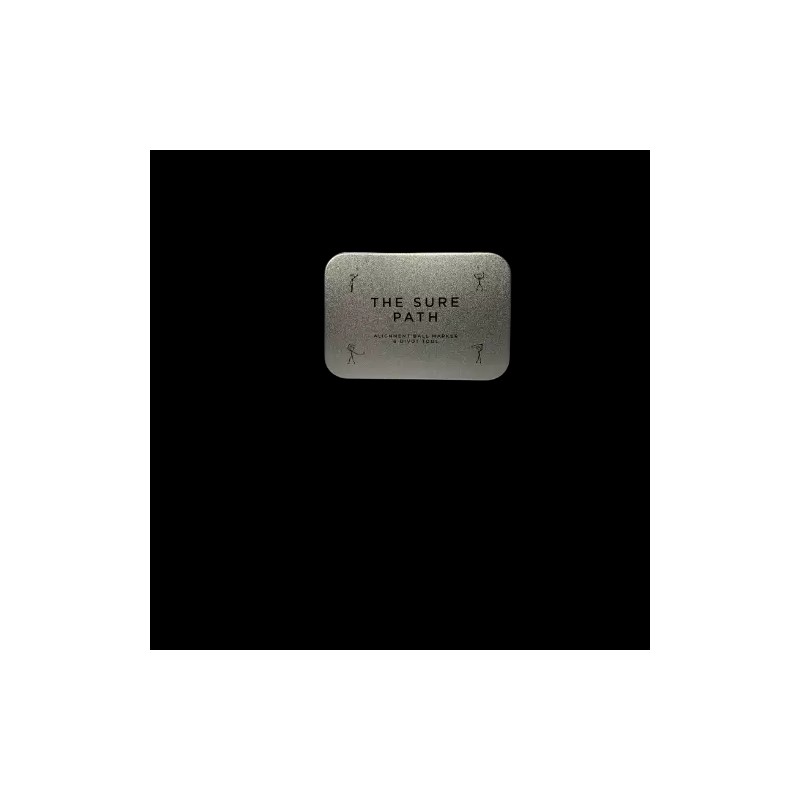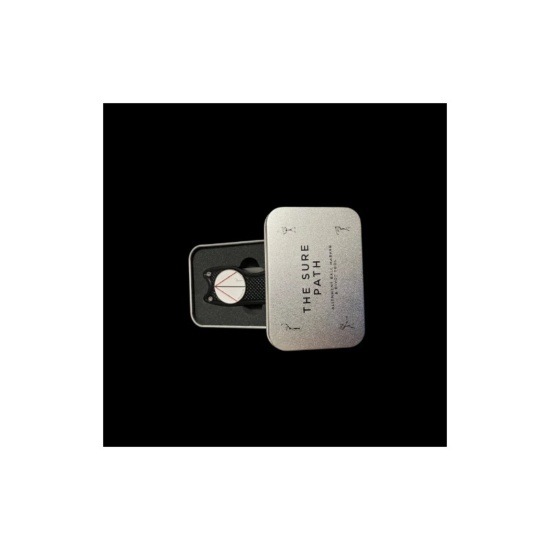 The SURE PATH Ball-Marker & Divot Tool is an excellent accessory to enhance your putting alignment. To use it, first place the SURE PATH ball-marker behind your ball on the green. Determine the correct path, then remove your ball and examine the ball-marker's path. When you replace your ball, align the line on your ball with the black line on the SURE PATH marker. Additionally, this tool features a convenient switchblade divot repair tool.
