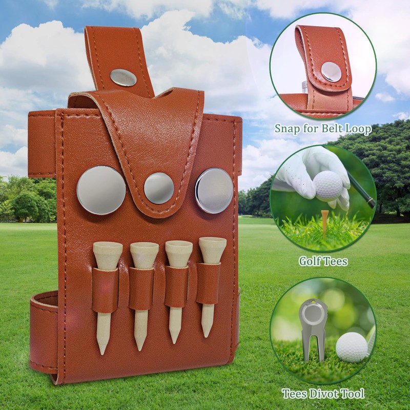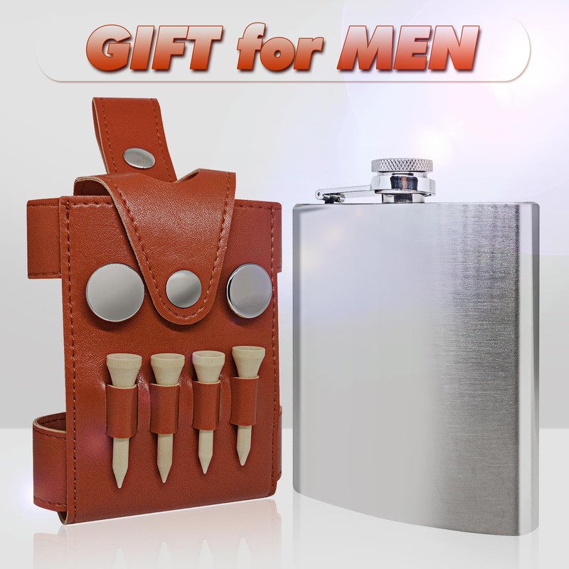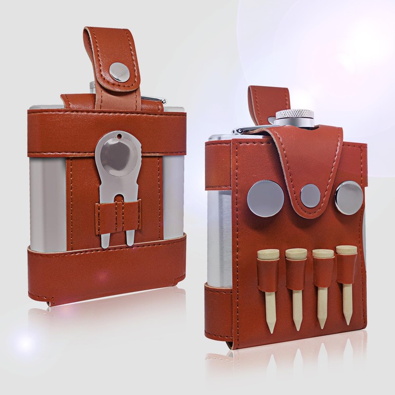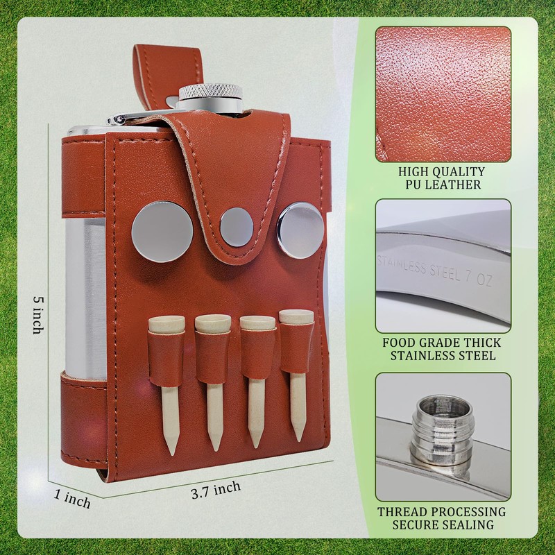 - Versatile Golf Accessories: Elevate your golf game with this multifunctional gift set. This golf flask includes a 7 oz stainless steel flask with a stylish leather case, a handy divot repair tool, and four wooden golf tees. These golf essentials are designed for both men and women and are perfect for golf enthusiasts.