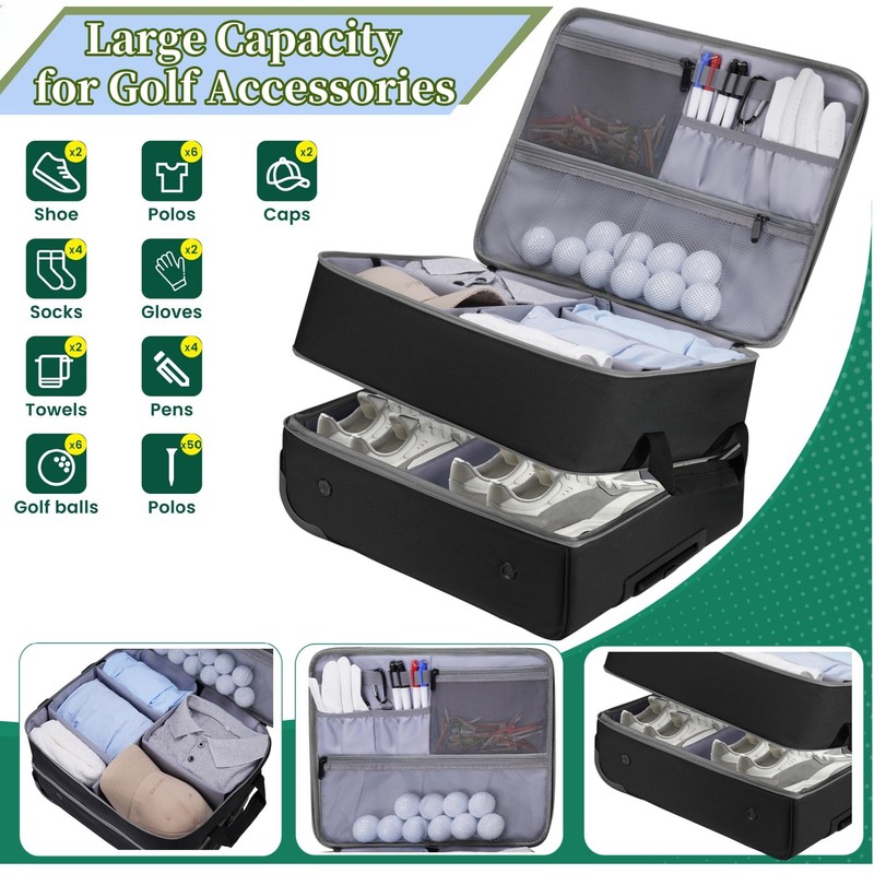 - LARGE STORAGE SPACE:Golf Trunk Organizer with double wheel and pull rod, has 2-layer design, the first layer compartment can store various golf supplies such as caps, golf ball boxes, shirts, and other supplies & clothing. The bottom features a separate compartment for golf shoes with ventilation holes to keep air circulating around your shoes. (Holds 2 pairs of shoes up to size 11)
