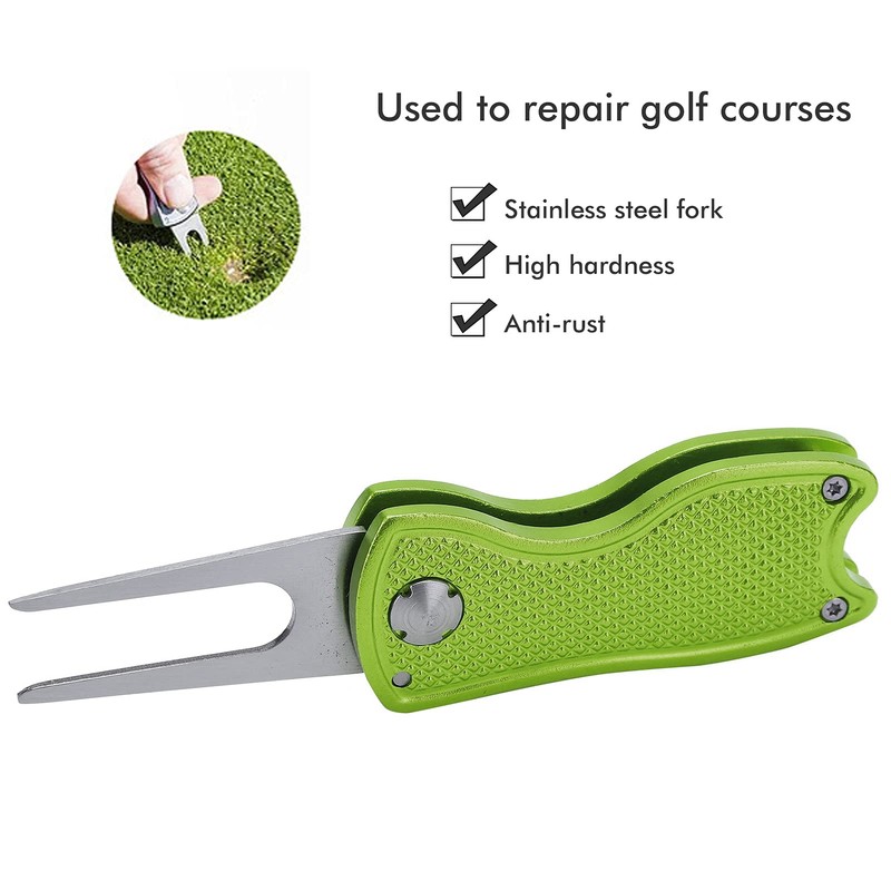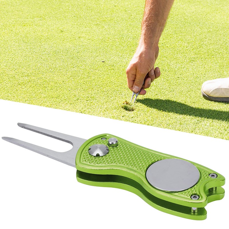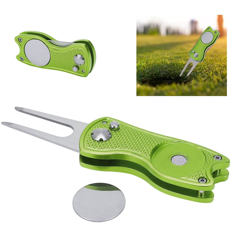 Golfer Green Fork, Stainless Steel Golfer Fork Metal Folding Golfer Divot Putting Green Fork Divot Repair Tool (Green)