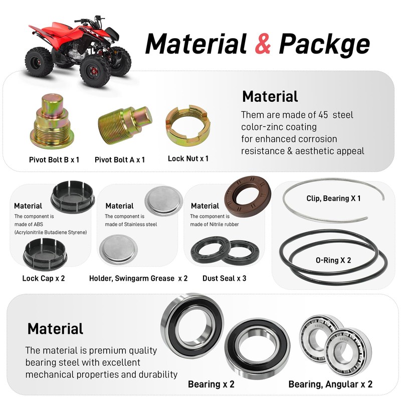 - PACKGE: Lock Cap x 2 Bearing, Angular x 2 ,Seal x 2 Holder, Grease x 2 Pivot Bolt A x1 Pivot Bolt B x 1 Lock Nut x1,O-Ring x2,Bearing x 2,Dust Seal x 1,Clip x 1