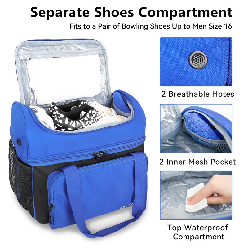 - 【Carry All Gear In One Bag】2 ball bowling bag is large enough to carry all your bowling accessories, consisting of a main compartment for 2 bowling balls, 1 front pocket, 1 back pocket, 2 side pockets and a dedicated shoes compartment(with ventilation vents) for a pair of shoes (up to men's size 16) and other gear. The front bag of the bowling bag is made of insulation material, which is enough to hold 5 cans of drinks. You can share cold drinks with friends who are resting.