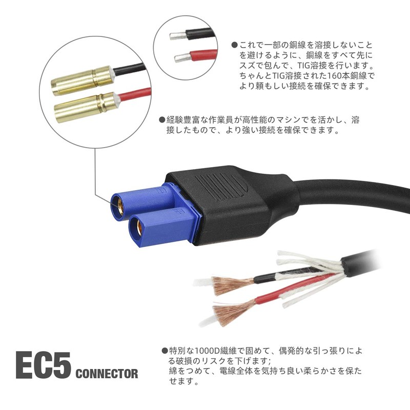 - ★ Designed EC5 connector to ensure connection with jump starter. (Well made EC5 connector) 1. EC5 connector that can withstand 30 Ah intrusion current. 2. Ergonomically designed plug and the battery is designed to prevent loosening from the battery when connected to the battery to ensure stable connection. 3. To avoid welding some copper wires, all copper wires are wrapped in tin and TIG welding. 160 strands of TIG welded copper wire ensures a more reliable connection