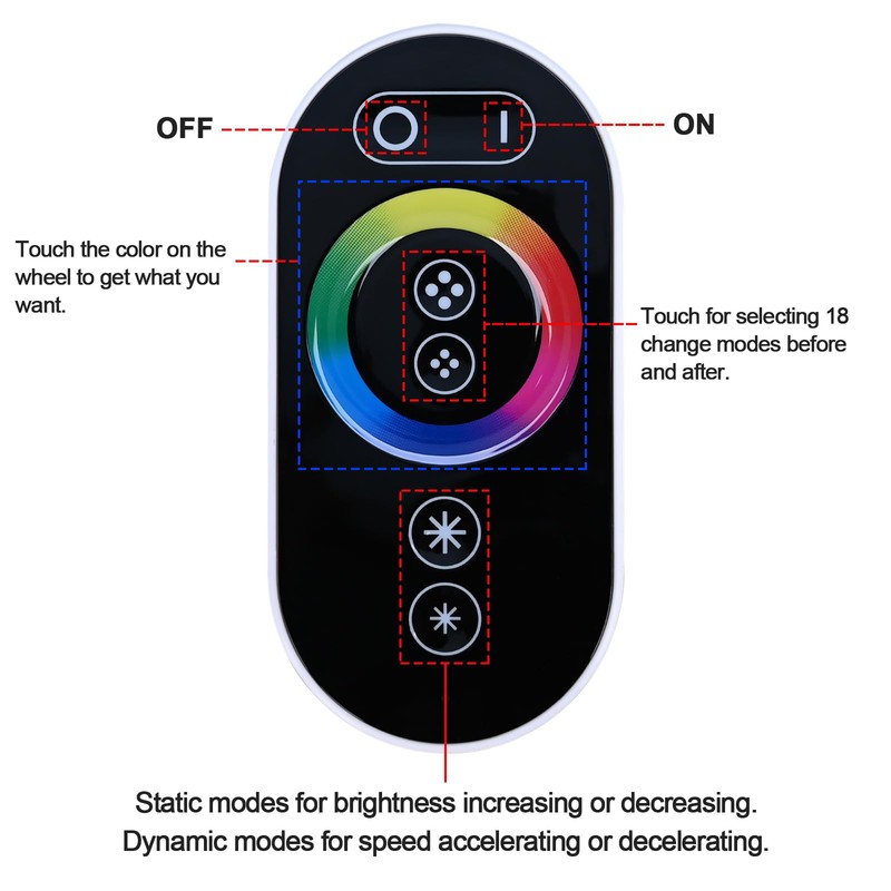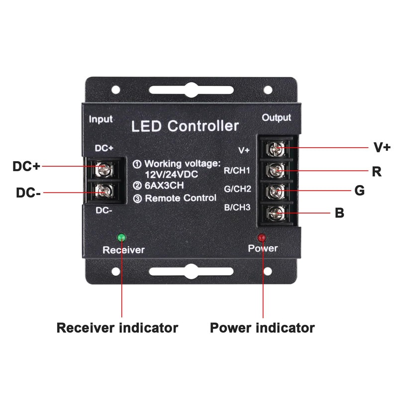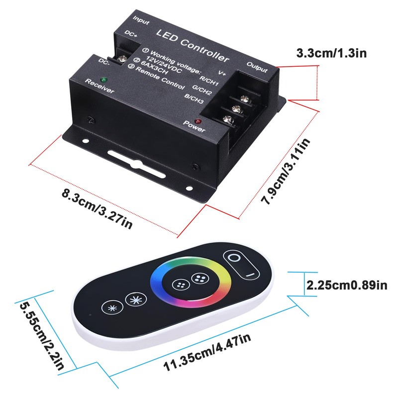 - 【12-24V PWM RF RGB Controller】Remote control with touchable buttons,Loadable current 6A X 3CH, max. 18A.