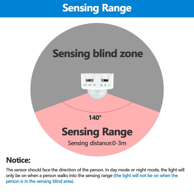 - 【Warm Reminder】When installing, the sensor should point in the direction of the person. In day mode and night mode, the light will only turn on when a person enters the sensing area. (When the person is in the blind spot, the light will not turn on). When the sensor is facing a heat-generating object or animal, the sensor will be triggered by mistake.