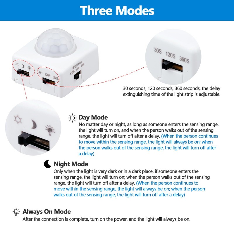 - 【Multiple Modes】3 lighting modes: day mode, night mode, constant light mode; 3 delayed off time: 30 seconds, 120 seconds, 360 seconds; 3 brightness modes: 10%, 30%, 100%.