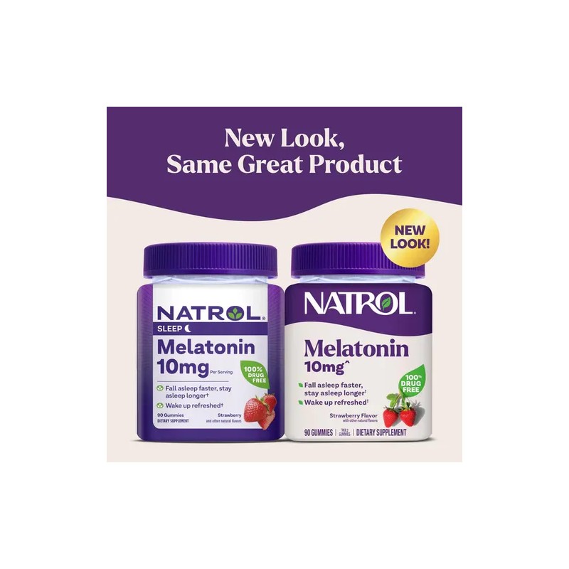 Gomitas de melatonina Natrol, Apoyo al sueño para adultos, Suplemento de melatonina de 10 mg para dormir, 90 gomitas con sabor a fresa, suministro de hasta 45 días