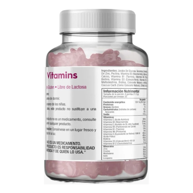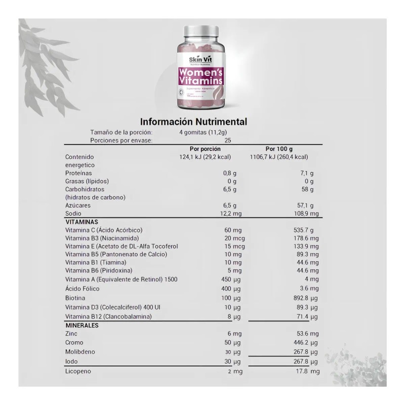 - Gomitas Multivitamínico Mujer Vitaminas Colágeno Biotina 100 Suplementos alimenticios Skin Vit con ingredientes importados de alta calidad, envasados en México cumpliendo con los más altos estándares y la normativa sanitaria del país. Estas gomitas están diseñadas específicamente para satisfacer las necesidades nutricionales de las mujeres, proporcionando una combinación de multivitaminas, colágeno y biotina que promueven la salud de la piel, el cabello y las uñas. Cada porción contiene 2.8 g de nutrientes esenciales, y el producto es libre de gluten, lo que lo hace apto para diversas dietas. Además, cuenta con un formato práctico y delicioso que facilita su consumo diario. Recuerda que este producto no es un medicamento; su uso es responsabilidad de quien lo usa y quien lo recomienda. ¡Incorpora estas gomitas a tu rutina diaria y disfruta de sus beneficios! Aviso legal