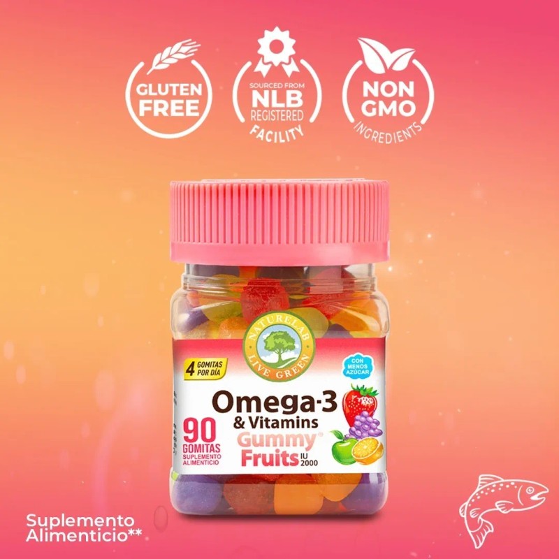 Nutre a tu familia con Naturelab Gomitas Omega 3, Vitamina D y E. Estas 90 gomitas sabor a frutas (fresa, naranja, manzana verde y uva) apoyan el desarrollo cerebral, la salud cardiovascular y fortalecen el sistema inmune. ¡Son veganas, sin gluten, sin lactosa y perfectas a partir de los 4 años! Sin sabor a pescado, solo delicioso sabor.