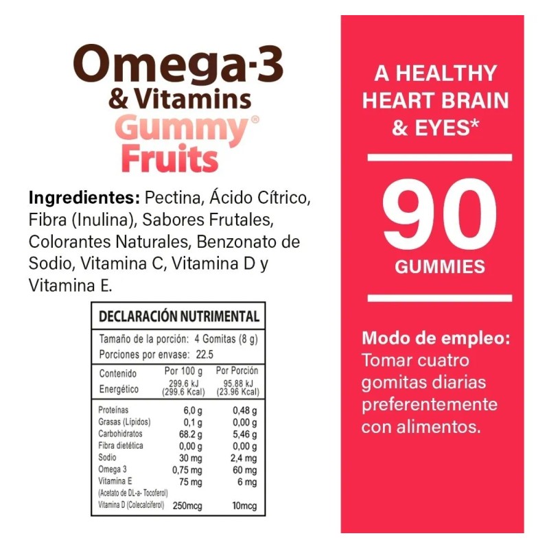Haz que la suplementación diaria sea un placer con las Gomitas Omega 3 con Vitaminas D y E Sabor Frutales de Naturelab. Este innovador suplemento viene en un práctico envase de 90 deliciosas gomitas con una mezcla de sabores naturales a fresa, naranja, manzana verde y uva, haciendo que la ingesta de nutrientes esenciales sea fácil y agradable, especialmente para los más pequeños a partir de 4 años.