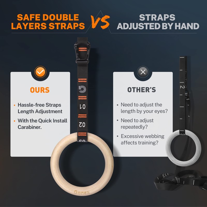 - 【Safe Double Layers Straps with Printed Digital】 Gonex Gymnastic Rings have Double Layers Straps to ensure Super Security. 1.37IN X 8.5 FT Double High strength polyester straps are printed with Arabic numerals for hassle-free strap length adjustment. No need to adjust the length by your eyes. No need to adjust repeatedly. You can adjust both straps to the same height very easily and quickly.