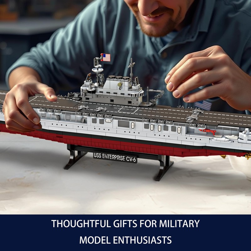 Experience the thrill of constructing a piece of naval history with the Gonli USS Enterprise CV-6 Aircraft Battleship Building Set. This meticulously designed 1883-piece model captures the essence of the iconic WWII aircraft battleship, renowned for its significant role in naval warfare. Measuring an impressive 30 inches in length, the model boasts intricate details such as maneuverable turrets, lifeboats, radar antennas, and molded aircraft on the deck. The integrated pulley system brings the model to life by activating all four propellers as the ship moves, offering an engaging building and play experience. Crafted from high-quality ABS plastic, the set ensures durability and compatibility with other major brick brands. The included step-by-step color instruction manual facilitates an enjoyable assembly process for builders aged 8 and above. Whether you're a history buff, a model-building enthusiast, or seeking a unique gift, this USS Enterprise model serves as a captivating display piece and a testament to naval engineering. Build, collect, and relive history with this exceptional navy aircraft battleship model kit!
