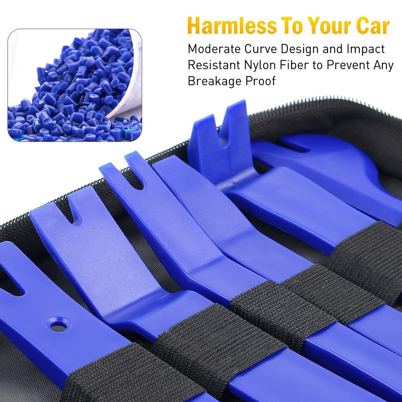 Tougher Trim Removal Tools Adopted impact resistant nylon fiber material, there is also a bit of flex in the trimming tools but they do not bend, which is hard enough to install or remove car audio system, dashboard, door grab handle, vent and other accessories Perfect for anyone 19pcs prying tools can meet all your needs, time and effort-saving for most interior and exterior car modification. Installing Or Removing Stereo System Door Panels, Moldings, Window Trims, Clips, Or Any Plastic Piece In Your Car Without Damaging The Car Like Metal Tools. Tips: To prolong the lifetime, keep it in a cool place and avoid direct sunlight. During big strength needed occasions, please use the metal fastener remover to help as METAL IS ALWAYS STRONGER THAN PLASTICS. Package Include: 11* Interior trim disassemble tools 3*Car terminal removal tools 2* Release tools 2* Stereo removal tools 1* Trim Clip Removal Pliers 1* Portable storage bag