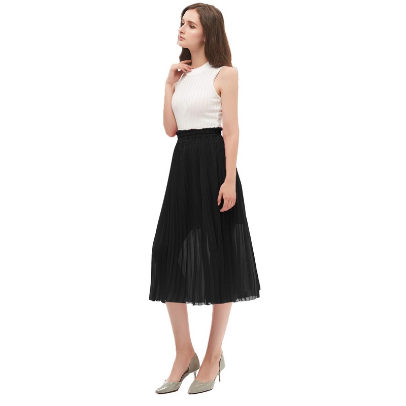 GOOBGS Women's Pleated A-Line High Waist Swing Flare Midi Skirt Black Large/X-Large