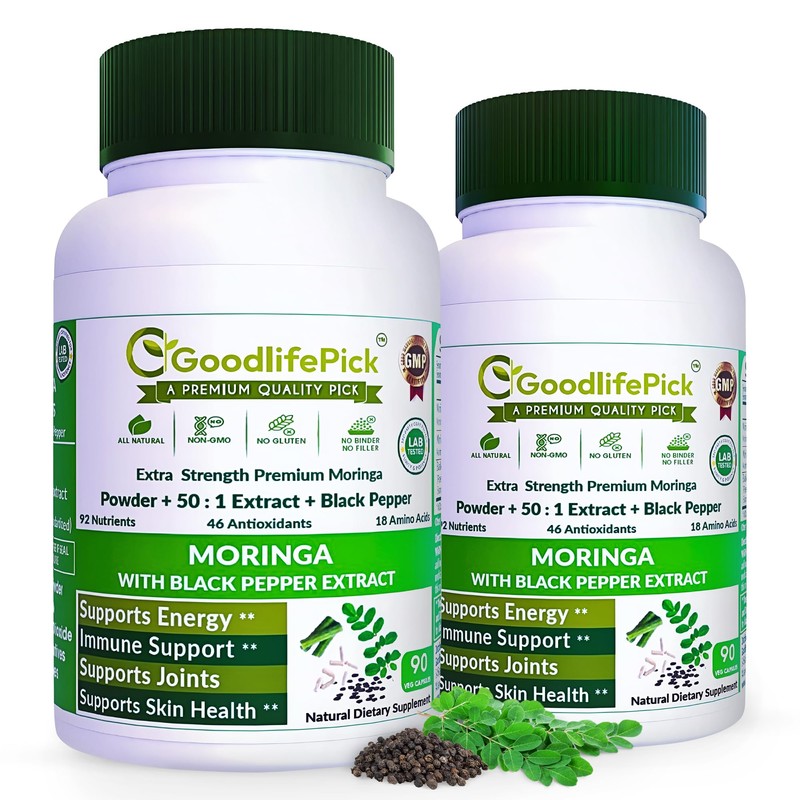 GoodlifePick Premium Moringa Capsules. with Black Pepper from Handpicked Moringa Leaves with 50:1 for Overall Wellness 90ct AllNatural NonGMO Lab-Tested No Rice Powder No Filler Vegan (Pack of 2)