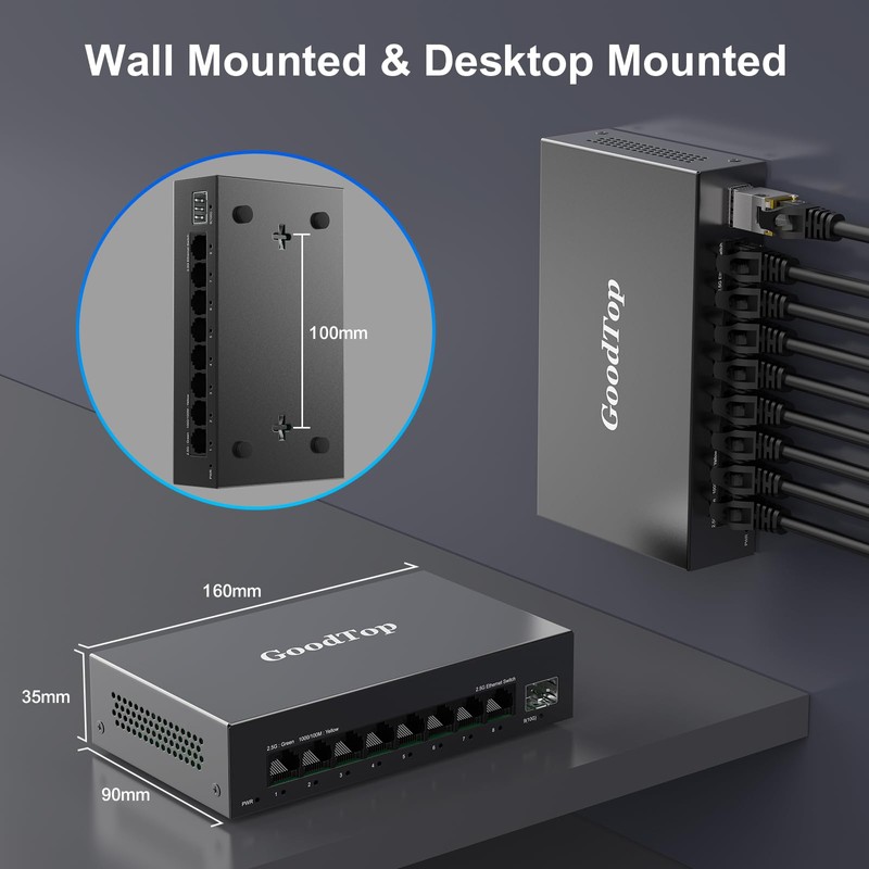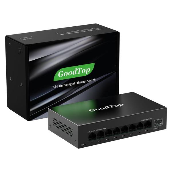 - ►【2.5Gb&10Gb Switch】This switch is equipped with 8 x 2.5G Ethernet Ports and 1 x 10G SFP+ Slots. 2.5G ports supports 10/100/1000M/2.5G adaptive speed and Auto MDI/MDIX. 10G SFP+ Slots supports 10M/100M/1G/2.5G/10G speed,and compatible with GoodTop RJ45 copper modules,optical fiber modules,10G DAC and AOC cable. (Note: The 10G SFP+ port might be not supporting special GPON/XGSPON modules from some Internet Service Provider).