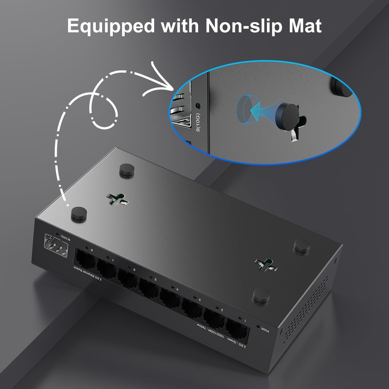 - ►【Metal Housing & Fanless Design】With fanless design,the switch can work silently and dissipate heat through vents and metal shell. On the bottom of switch, there are mounting holes so one can use two screws to mount the switch to a desk, wall, or elsewhere. This switch comes with four Non-slip mats which can be stuck at the bottom of switch. Make it stable on desk. Besides,this is a very small footprint switch that can be mounted just about anywhere.