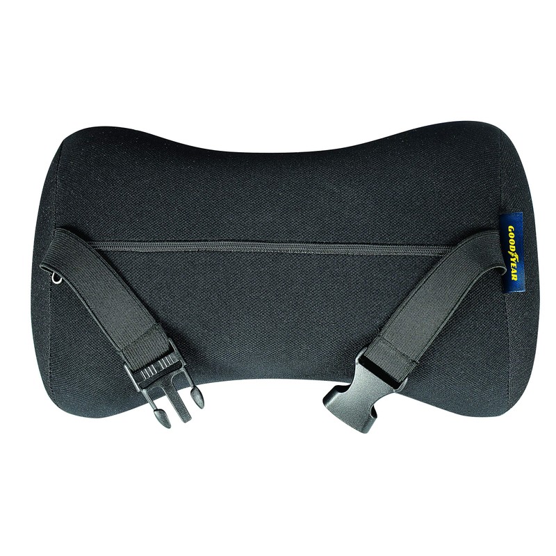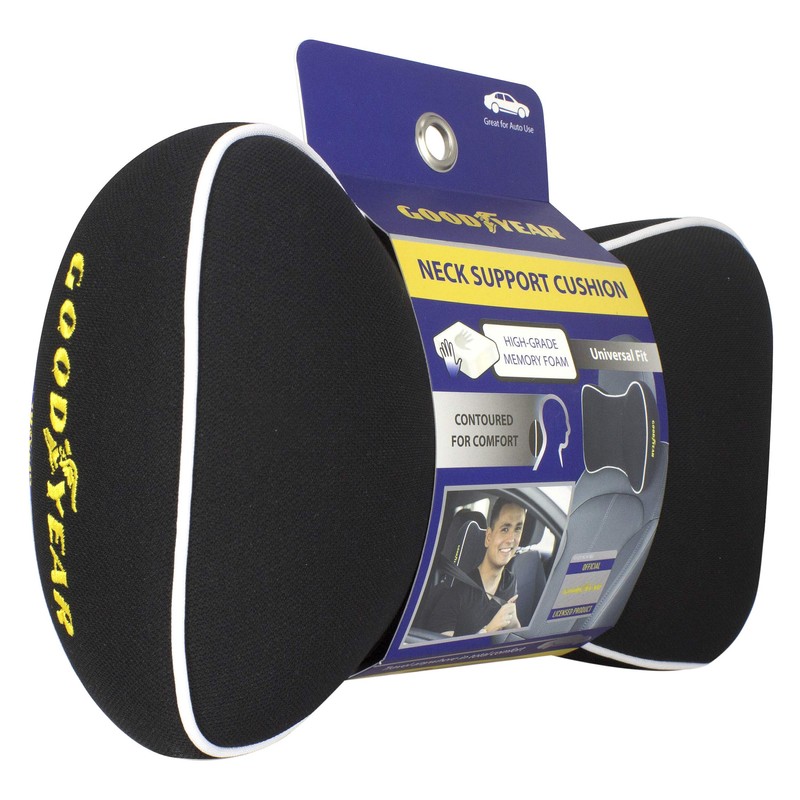 - UNIVERSAL FIT - The best part of Goodyear’s Car Seat Neck Support Pillow is its versatility! It can be installed in a any type of seat with a headrest, such as the car, a plane, or a desk chair with a headrest. An adjustable strap accommodates headrests of many circumferences. The pillow is also designed to leave plenty of room for your seat belt. Dimensions: 7.25” x 12.25” x 4.25”