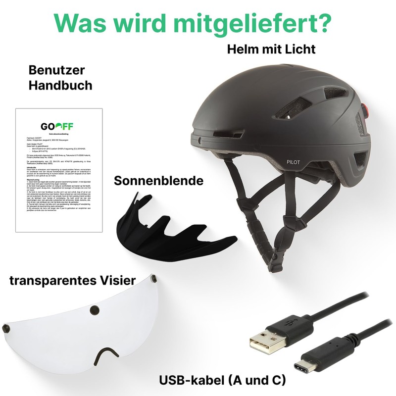 - *NTA 8776 Certified: NTA 8776 Certified S-Pedelec Helmet up to 45 km/h. With adjustable visor: the speed pedelec helmet has an adjustable visor. Protects against wind, dust and insects. Lightweight and comfortable: this e-bike helmet with visor weighs 350 grams, making it the lightest in its class. Experience a comfortable wearing experience without straining your neck. Built-in LED tail light: built-in LED rear light for safety in traffic. 3 adjustable positions, different modes (steady, flash, light sequence). FREE CHARGING CABLE - Included is a USB-C cable for the helmet lamp. It has a USB-A port for charging.