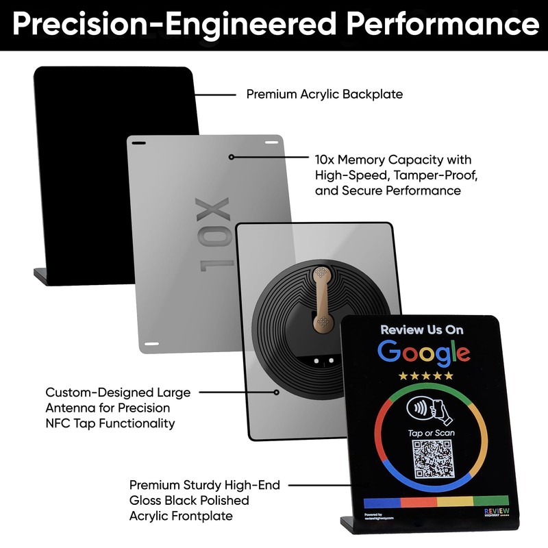 - ▶️PRECISION-ENGINEERED PERFORMANCE: Discover cutting-edge tech with our large sized glossy-acrylic Google Review Stand. Enjoy unparalleled rapid NFC tap and quick Smart QR code scan with 10X memory capacity and high-speed tamper proof performance.