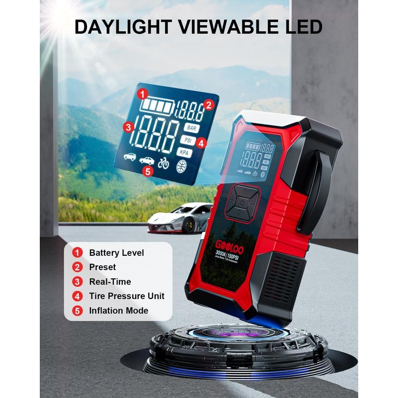 GOOLOO A3 Portable Car Jump Starter with Air Compressor, 3000A Car Battery Jump Starter (9.0 Gas/6.5L Diesel) with 150PSI Digital Tire Inflator, 12V Supersafe Jump Box Car Battery Jumper Starter