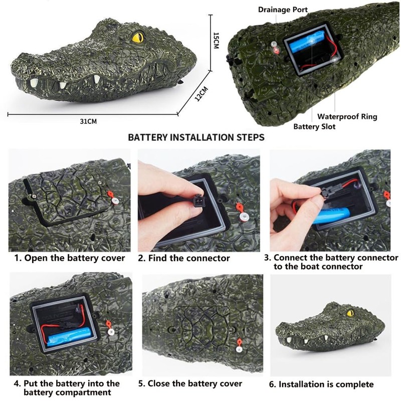 •2CH RC Boat: 2 channel operation of moving forward, turn left and right simulates the speed and movement of the real crocodile. It is great for the pool and lake.