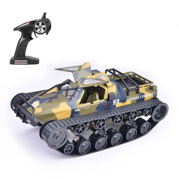 - Full-scale design, proportional control. Simulation dual flow drive gear box; Rotate 360° in situ; Cross-groove distance up to 10cm; Climbing slope 30°; The wading depth can reach 5cm; Openable gull-wing door; Front wheel self-adjusting track tightness.