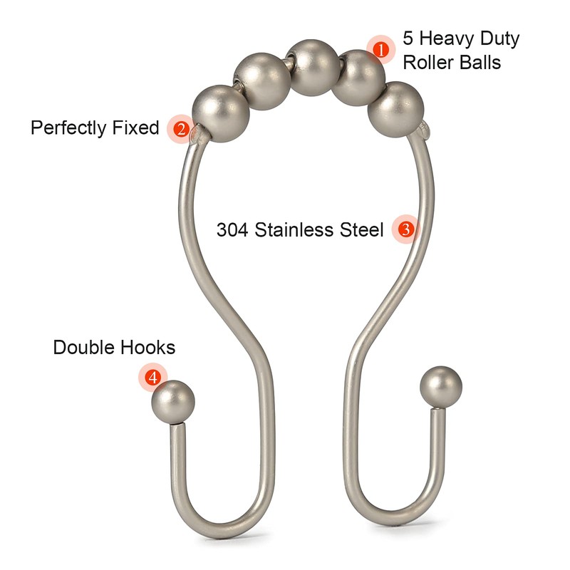 - [SMOOTH GLIDING]: The shower curtain rings are designed with spherical roller balls, make it easy to slide on the shower curtain rod without scratching the shower curtain rod, which can prevent hooking and pulling.