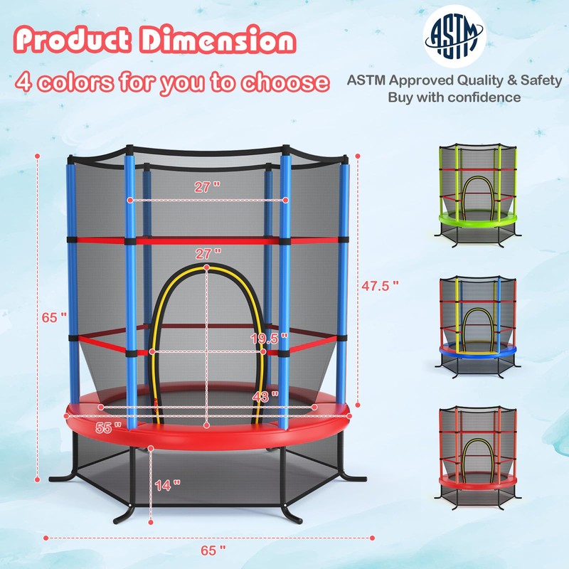- 360° Comprehensive Safety Protection: This toddler trampoline comes with 48" high enclosure net that allows kids to jump freely without worrying about falling. The bottom of the trampoline is also surrounded by the net to prevent kids from crawling under the trampoline. The waterproof safety pad is filled with thick padding and the net poles are covered with foam to avoid collision.