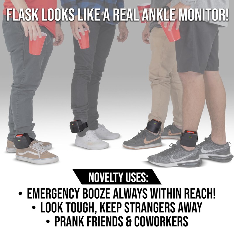 - FROM BEHIND BARS TO OPEN BAR: This funny novelty flask is the only ankle monitor that guarantees a good time; Onlookers will be so distracted by your past criminal life they would never dream that you're actually wearing a flask