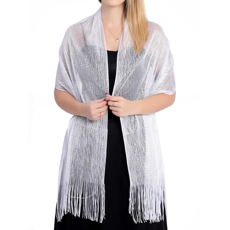 - White shawl is made of polyester. The combination of sparkling metal threads and delicate fringe is very eye-catching.